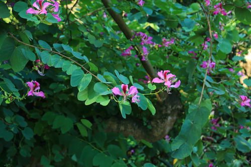 如果万一,你发现开紫红色花的红花羊蹄甲树上同时挂了果荚,那也不用惊慌。一般来说,这株树是嫁接的,就是在植株小的时候,将红花羊蹄甲的枝条嫁接在洋紫荆或羊蹄甲的树上。仔细观察一下树身,就会发现嫁接时留下的刀口痕迹,嫁接位之上的枝条开出紫红色的花,嫁接位之下长出的枝条则挂上了果荚。