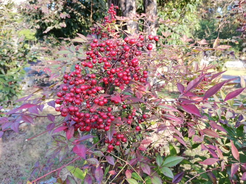 南天竹是有毒植物,夺目的红果子吸引四面八方的鸟儿来觅食,鸟儿享受美味后将扁圆形种子传播到遥远的他乡。然而,鸟能食,人却不能,只可远观不可亵玩。南天竹根、叶具有强筋活络,消炎解毒之效,果为镇咳药。南天竹内含一系列生物碱,其中小檗碱是感冒药中经常出现的成分。