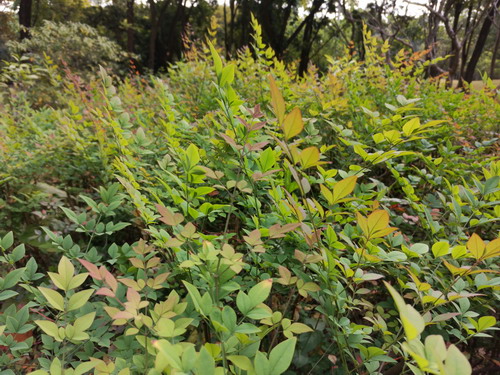 华南植物园中心大草坪路边树下,一大丛披着冬日阳光的南天竹,老叶是鲜艳的红色,枝顶新叶似晕染的红棕色,边缘更红,内里红绿相间,树中的叶片是一如既往的碧绿,整一树五彩斑斓,自然之美映入眼帘。
