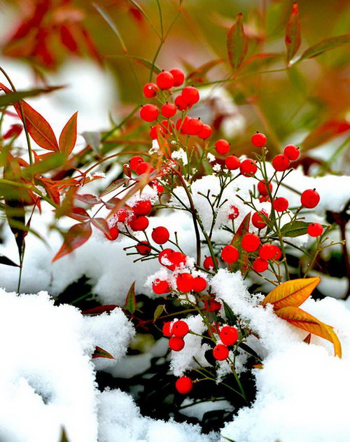 南天竹果期5-11月,浆果球形,初为绿色,慢慢变为红棕色,最后在萧瑟的秋冬里沉甸甸地垂挂枝头。时值大雪节气,至此而雪盛已,试想一下白雪皑皑中诗情画意的南天竹,更可谓“雪中视之尤佳”。比起夏天的花来,秋冬季节里,南天竹鲜艳的叶子和红如丹砂的果子更加引人瞩目,给人丰收、充盈的喜悦。“最是人间留不住,朱颜辞镜花辞树。”美好总是转瞬即逝,南天竹的红果果则不同,果实宿存时间长达半年之久,让人乐在其中,不知老之将至。