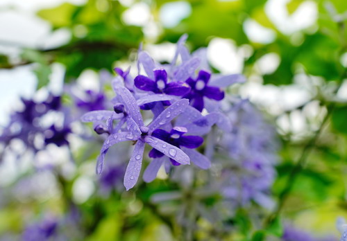 蓝花藤(Petrea volubilis L.),马鞭草科蓝花藤属,多年生常绿木质藤本植物,她的叶子单叶对生,长圆状倒卵形,边缘有波状齿,质地两面粗糙有如砂纸,可以用来擦亮锡器。因此有些地方将其称之为“锡叶藤”或“砂纸叶藤”。蓝花藤外号还很多,还有人称之为“紫霞藤”“紫绒藤”等。商家取“锡叶藤”的谐音叫它“许愿藤”以增加市场的接受度。在种植环境上,蓝花藤性喜温暖,全日照或半日照环境均可,以肥沃的砂质壤土为佳,惧怕潮湿。如果温度低于10℃时,叶片则会冻伤变黑、渐渐掉落甚至停止生长,所以在低温地栽培时易受冻害,冬天寒流期间要移入室内栽培。