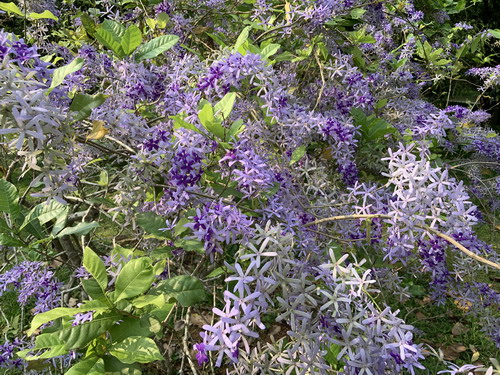 绿草丛中斜卧着一大丛盘根错节的藤本植物,沿着藤枝花环状的长满蓝紫色花朵,远远望去由高往下抛物线状向草地延伸。看惯了种种大朵红花之后,走进这株正值盛花期的“蓝花藤”,一下子被这么美丽的蓝紫色所惊艳。在华南植物园藤本园见到的这种观赏植物,她的老家在墨西哥、西印度群岛及中美洲。自从引进中国后很快就在南方声名鹊起成为网红。据了解,目前蓝花藤在华南植物园、福建厦门植物园、泉州等地都有栽培。