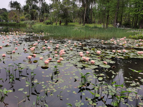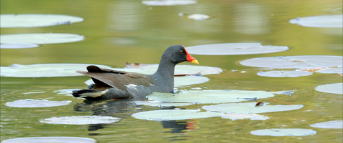 黑水鸡在清晨或傍晚没人的时候会来到池塘左边的方块区域行走,寻找食物。这里是以睡莲为主的水生植物种植池,面积不大,但种类各具特色和具有较高的观赏价值,每当开花时节竞相开放,有洁白无瑕的澳洲巨花睡莲(Nymphaea gigantea),红黄色的著名睡莲万维莎(Nymphaea ' Wanvisa '),粉粉萌萌的香睡莲(Nymphaea odorata),婷婷玉立的泽泻慈姑(Sagittaria lancifolia),小巧玲珑的萍蓬草(Nuphar pumila),婀娜多姿的垂花水竹芋(Thalia geniculata)以及绚丽的路易斯安娜鸢尾(Louisiana Irises)等等。不管经历了多少风风雨雨和寒暑,黑水鸡能在这里留下来并作为长期的栖息地,想必是这里的环境美观、安全宜居的原故,“闲来湖畔清幽处,红喙细梳黑羽裳”。