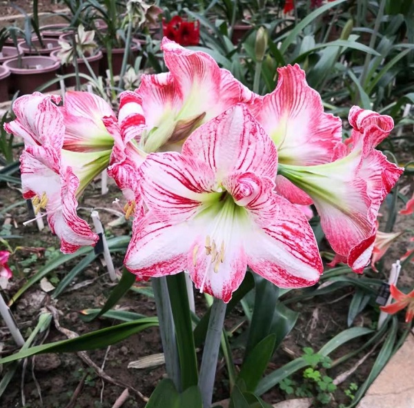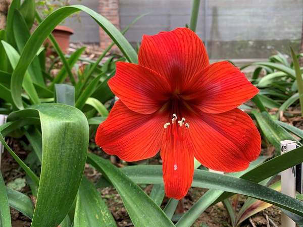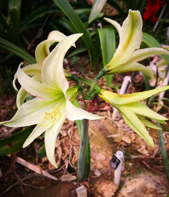 重点推荐一下本次在生物园展出的朱顶红品种,首先展示的朱顶红的原生种,也是我们常说的“土朱”了,花被洋红色,中间略带绿色,花漏斗状,雄蕊6枚,从花中央伸出,稍下弯,花丝红色,花药线状长圆形,与雄蕊相伴的一枚花柱通常伸直,柱头3裂。