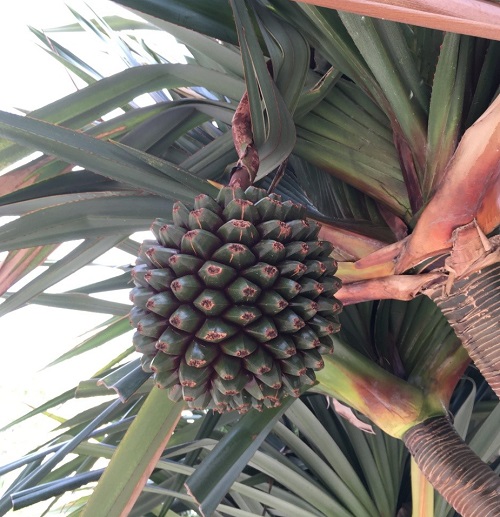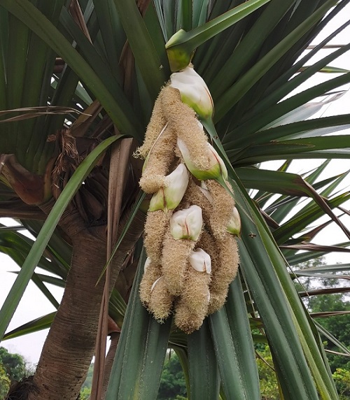 红刺露兜定植在露兜岛以来,雌株在2019年曾经开花结果,今年雄株首次开花 。淡黄色的花序就像悬挂着的一串大型珍珠吊坠,令人赞叹,吸引了众多蜜蜂的探访。不过,单个花序的开花时间比较短暂,目前正在花期中。