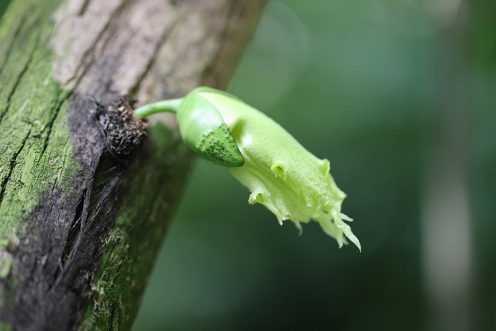 我们时常见到青绿光亮的铁西瓜挂在树上,甚是招摇,然而它的花却是非常低调的绿色,要是与叶一起混在枝条上,就更不容易发现。但也有例外,铁西瓜是老茎生花结果植物,常常也将花开在光秃秃的树干上。部分生长在茂密的热带雨林,中下层的树种会出现树干或老茎上开花结果的现象,比如热带水果菠萝蜜、木奶果等。热带雨林中物种丰富,植物为了争夺生存空间和动物传粉的机会,纷纷各显神通,此外粗壮的树干也能承受果实的重压。老茎生花结果是植物在热带雨林环境下的一种生态适应对策。