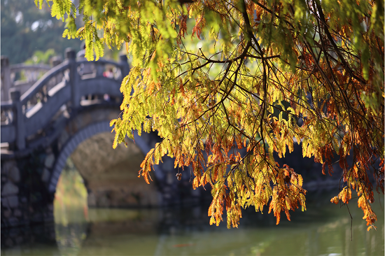 落羽杉飘逸的羽毛状叶片,春天稚嫩新绿,夏天浓绿葱翠,秋天黄绿相间,冬天蜕变为红叶,洋洋洒洒掉落一地,把大地覆盖上厚厚的红地毯。四季变幻在落羽杉身上体现得特别直观,在一年四季常绿的广州,是园林造景中美丽而富有特色的秋冬红叶观赏树种。