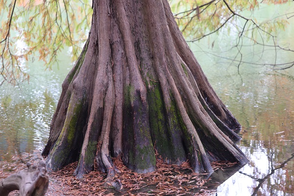 观赏植物有的观花有的观叶,对于落羽杉来说没有花,不如我们直接来欣赏根。在落羽杉主根周围涌出高低错落的棕红色“膝状根”(knee)有的纤细,有的粗壮,有单体如奇石,有的成片好似佛陀聚会,可谓千姿百态,让无数初次见到的朋友们啧啧称奇。这种奇异的膝状根,只有生长在长期浸水的浅水中或近水的地方,而生长在排水好的平地或坡地则没有。关于膝状根的作用曾有不同猜测,认为是“呼吸根”,后来科学家测定膝状根呼吸效率的研究排除了“呼吸根”的说法。目前普遍的观点是膝状根能够起到支持作用。