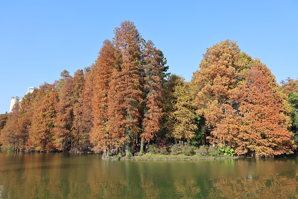 秋冬季节的落羽杉林,形成南国红叶独特的风景,每年12月至次年1月,其变色过程大约可持续一个多月。说到变色的原因,落叶树木叶色变化与其叶片组织中和呈色相关的叶绿素、类胡萝卜素、 生物碱类色素和黄酮类色素的含量有关。叶色变红是由于叶片中大量合成黄酮类色素中的花色素苷的结果,而花色素苷生物合成受多种因子诱导,如温度、光、营养供给、生长调控、代谢物以及组织的特殊发育阶段等,其中温度在叶色呈色过程中起着重要的调控作用。据观察,气温越低,落羽杉变色的速度越快;幼树比老树变色速度更快;光照充足条件下,生长在水中的落羽杉红叶期要长于陆生的,且有更好的整体观赏性。