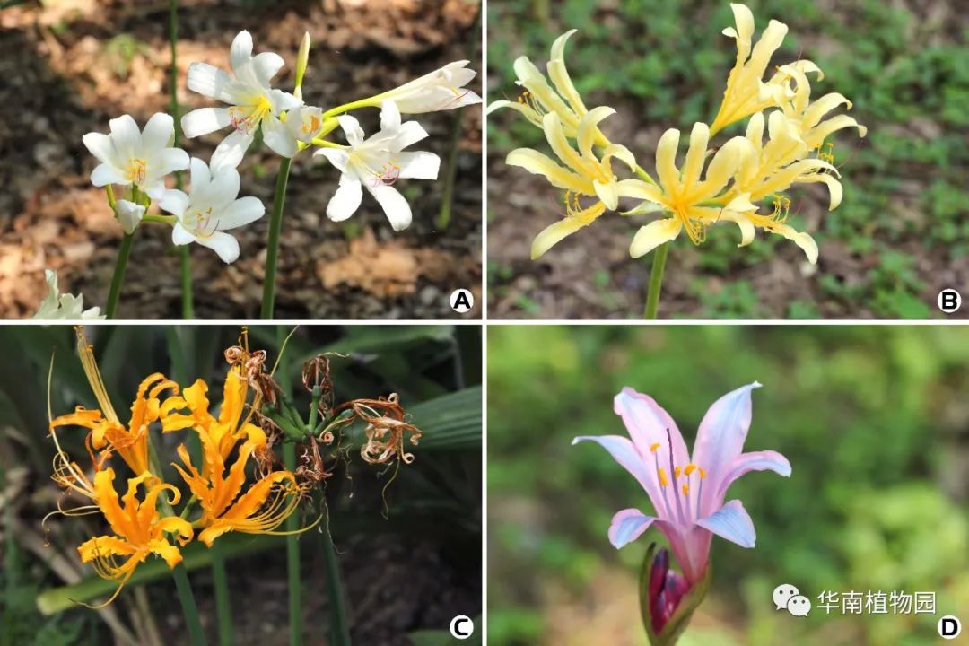 图3 石蒜属内一些拥有不同花色的物种(徐一大 摄)