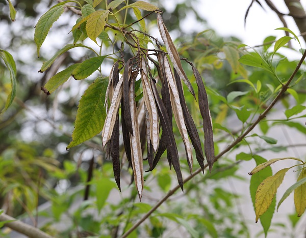 黄钟花成熟果实开裂,露出排成列的种子,种子有翅