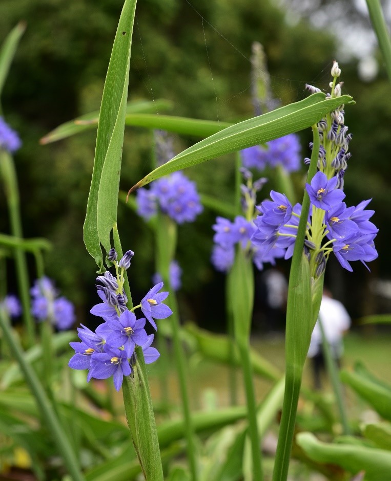 高亭雨久花特征明显,叶片基生,略微倾斜伸出水面,宛如斜插于水中的战戟;花亭高高直立于水面,数十朵蓝紫色小花总状聚生于花序上,如一群小鸟欲展翅飞翔。与常见的同属雨久花科植物梭鱼草、凤眼莲不同,高亭雨久花盛放于秋风起后的凉爽季节,花期只有15-20天,盛花期只持续1周左右。