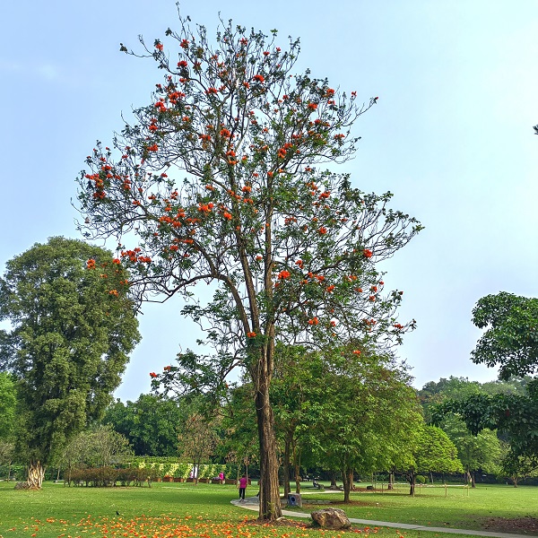 我是一棵秋天的加椰芒,叶子变得金黄,很有秋天的感觉。在我的脚下行人络绎不绝,时不时有人驻足观赏。我与红花羊蹄甲站在道路两边遥相呼应,我正在凋零,它正在怒放,生命的接力永续向前。