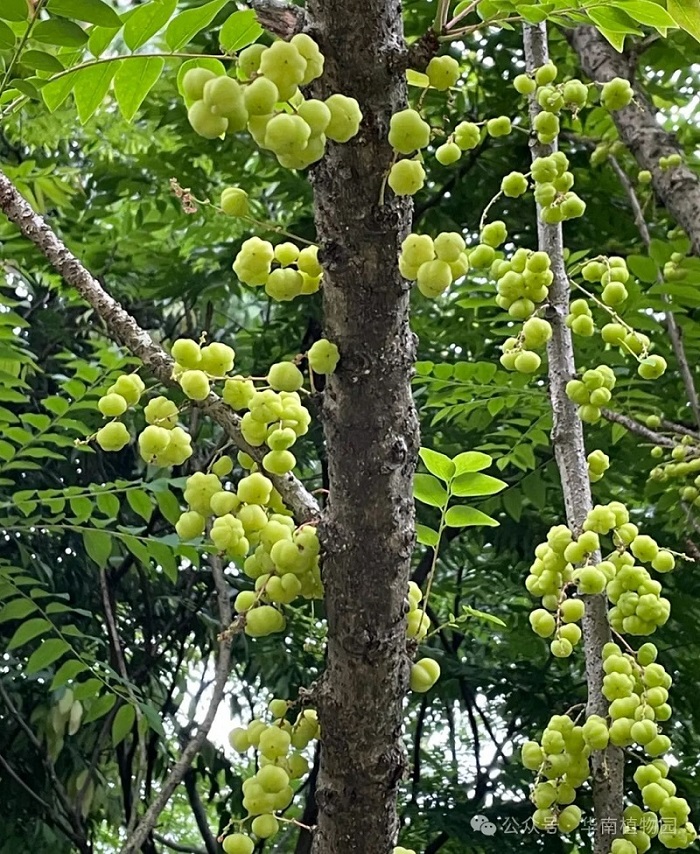 西印度醋栗原产于马达加斯加岛、印度、菲律宾、越南等地,作为热带雨林植物群落中下层树种,是典型的“老茎生花”和“老茎结果”,在茎干上开花结果方便昆虫传粉和避免狂风暴雨的袭击,有利于繁衍后代,其粗壮的树干也能承受果实的重压,不容易折断。这是植物的一种生存智慧,是植物在长期的演化过程中逐渐适应环境而形成的一种特有的生物现象。