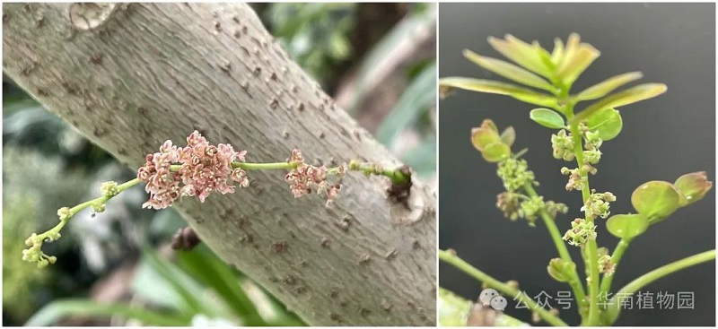 与引人注目的果实相比,花就低调得多了,在每年的3-4月期间,在树干和枝上就缀满了粉红或红色的小串或小堆的花。花小,无花瓣,单性,雌雄同株,多朵雄花和1朵雌花或全为雄花、雌花组成总状花序,萼片4,花红色或粉红色。雄花:萼片膜质,红色,圆形,雄蕊3-4。雌花:萼片长圆形,长3mm,边缘膜质,花柱3,顶端2裂。