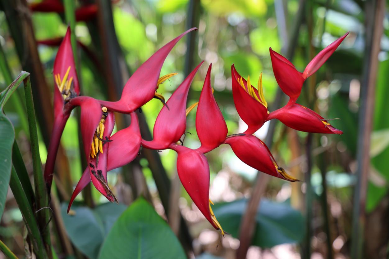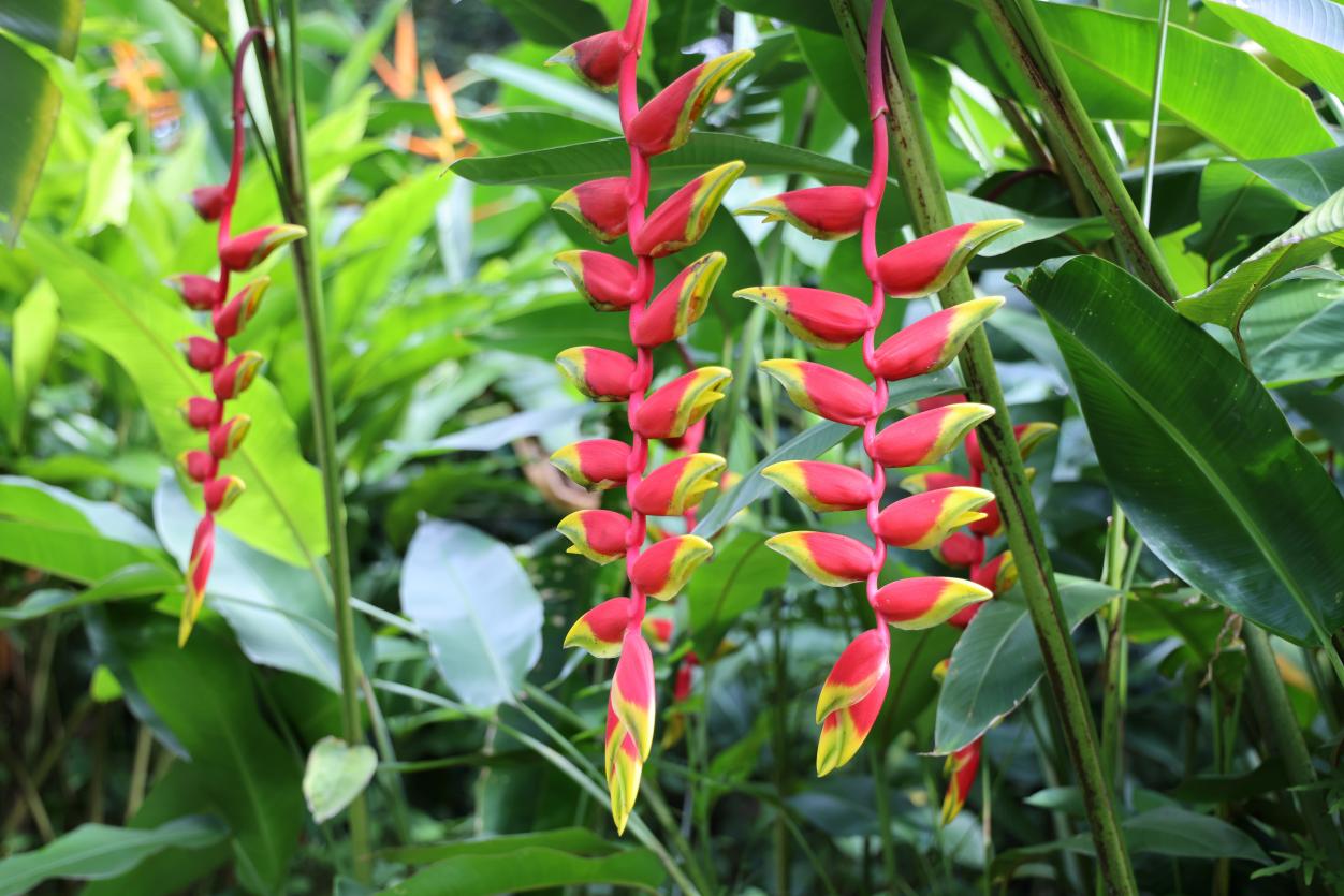 金嘴蝎尾蕉,花悬垂于枝间,排成二列,互不覆盖,基部红色,渐尖黄色,边缘绿色,花姿奇特。