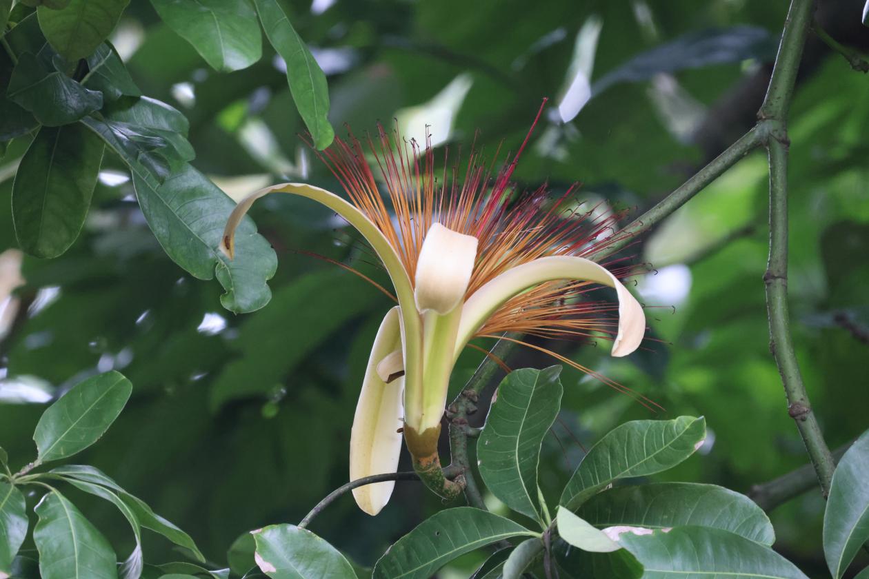 瓜栗,市场上常见的发财树(光瓜栗)的亲戚,晚上开花,淡黄色花瓣簇拥一团放射状花蕊,似烟花绽放。