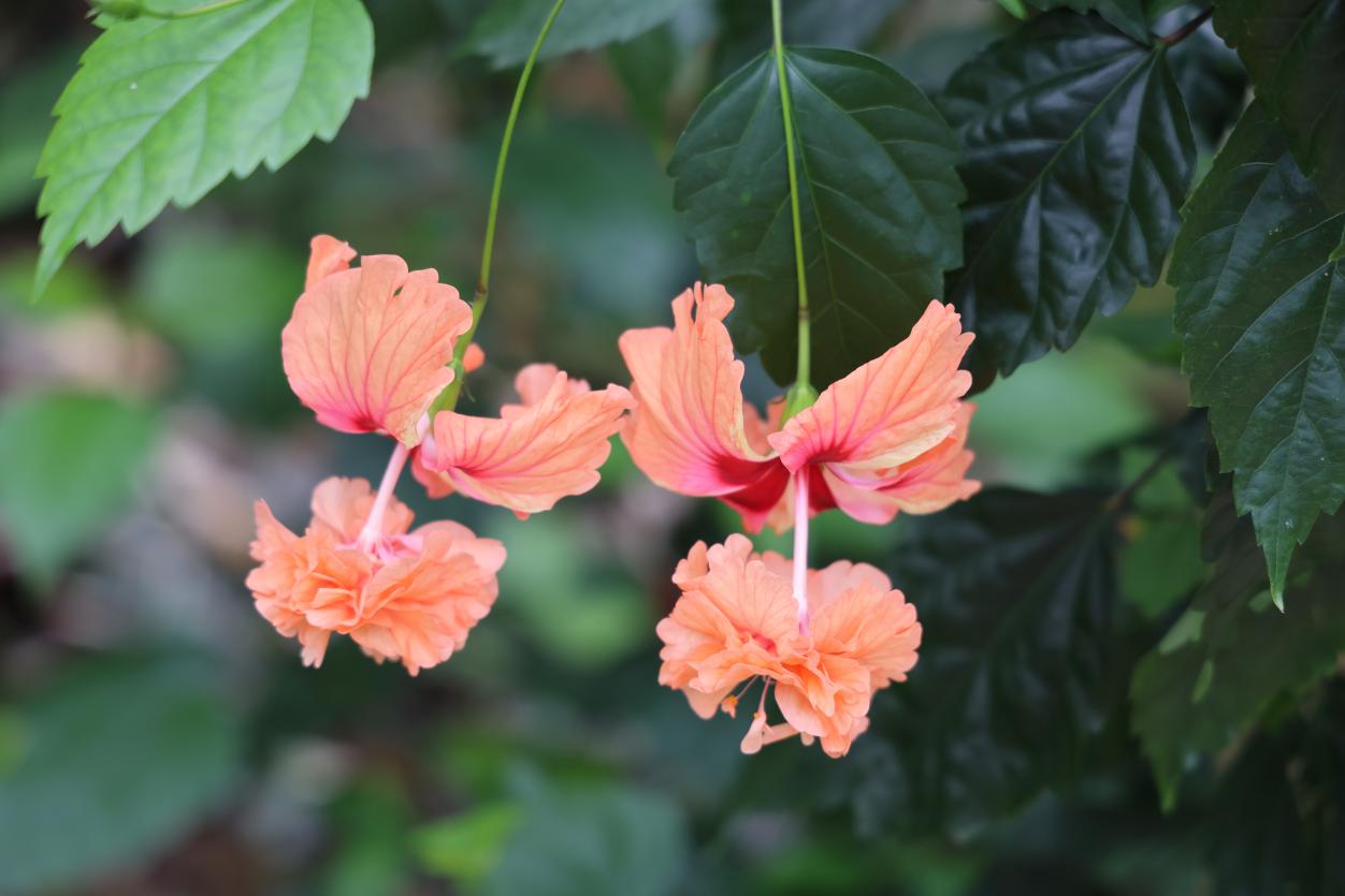 吊灯扶桑,又名灯笼花,花梗纤细下垂,花瓣深细裂呈流苏状向上反曲,雄蕊柱长而突出。