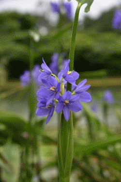 高亭雨久花特征明显,叶片基生,略微倾斜伸出水面,宛如斜插于水中的战戟;花亭高高直立于水面,数十朵蓝紫色小花总状聚生于花序上,如一群小鸟欲展翅飞翔。高亭雨久花盛放于秋风起后的凉爽季节,花期约15-20天。高亭雨久花植株高可达1.7米,堪称雨久花科植物里面的“巨人”。