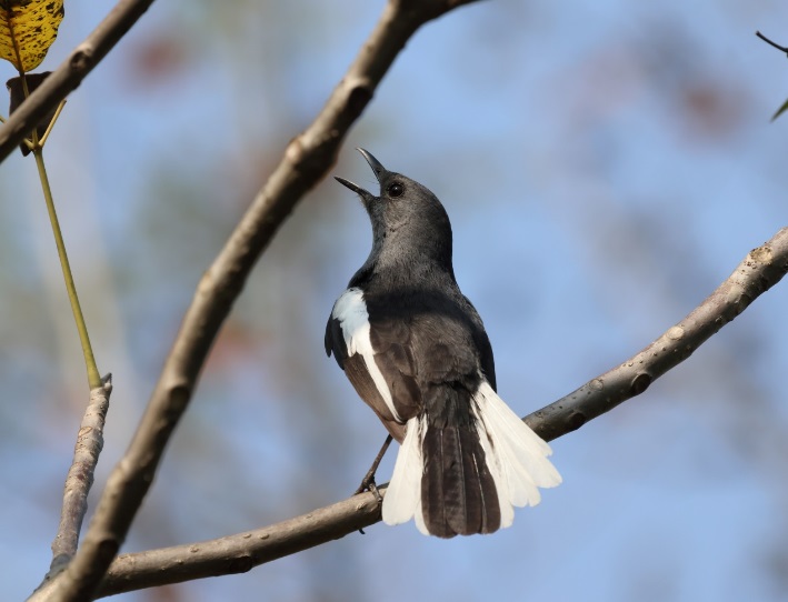 雄性鹊鸲(身体上半部为黑色)在枝头载歌载舞