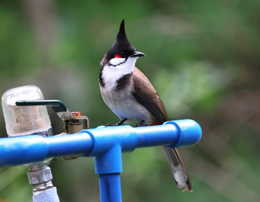 红耳鹎,头顶像抹了发胶一样,一撮黑色羽毛高高耸起,眼睛后下方长着两块漂亮的红胭脂。它性格活泼,不挑食,花、果、小昆虫乃至人类的食物残渣都爱吃。