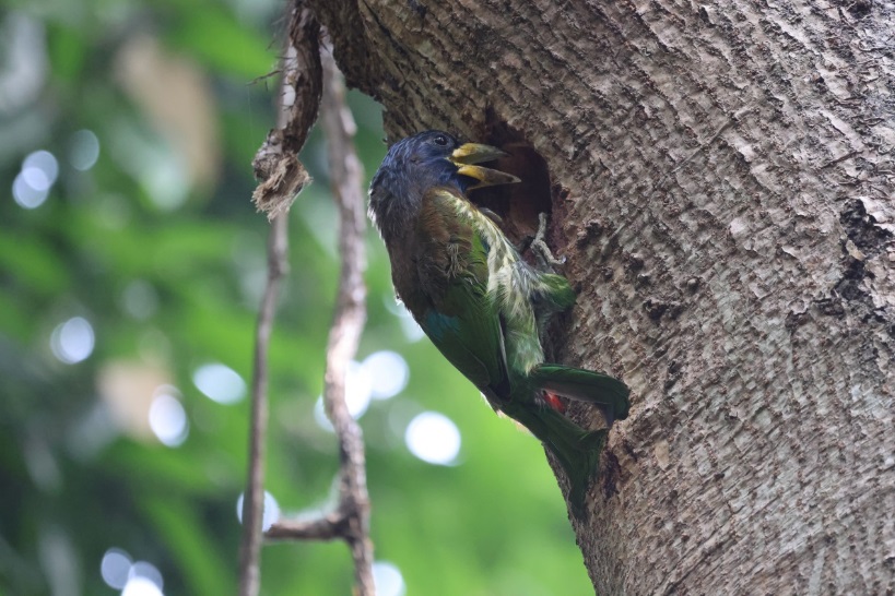 大拟啄木鸟,常来植物园的小伙伴,你可能没有见过大拟啄木鸟,但你一定听过它单调洪亮的歌声。黄色嘴巴坚实有力,喜欢在南洋楹杉树干上啄洞筑巢。