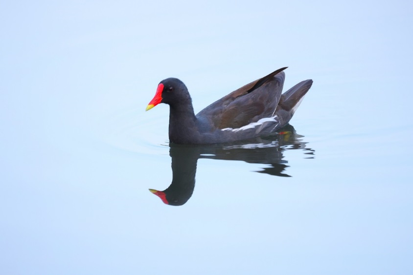 黑水鸡,身体黑白色,额甲和嘴红色,嘴尖端黄色。叫“鸡”不是鸡,脚没有蹼,它们所属的秧鸡科和鹤的关系更近。