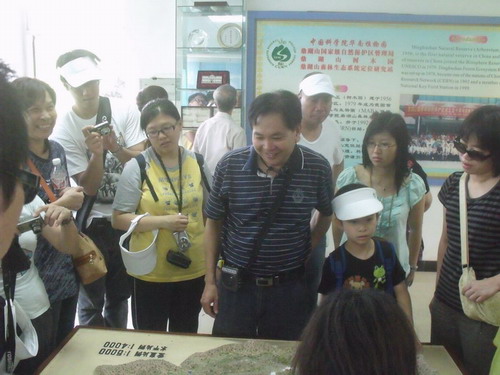 保护区管理局常务副局长黄忠良研究员亲自为澳门民众讲解鼎湖山情况,介绍鼎湖山具有400多年历史的阔叶林、神奇的森林景观、出色的科研成果、丰富多彩的科普活动等。随后,澳门民众走进生物多样性展厅,了解保护区历史,观看动植物标本,亲身走入季风常绿阔叶林和沟谷雨林,在保护区科普辅导员的指导下,认识了南亚热带森林特色,亲眼目睹了雄伟壮观的板状根,神奇的茎花现象,美妙的空中花园,古老的植物——活化石桫椤。还有全国负离子含量最高、最佳呼吸区——飞水潭瀑布,澳门民众切身感受了一个“来了就不想走”的地方。