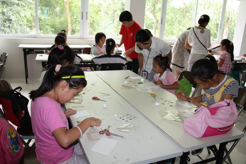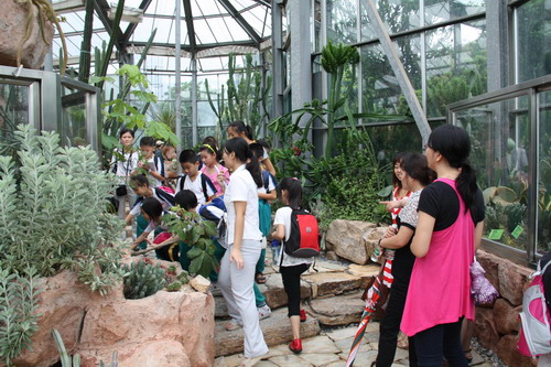 当天上午,夏令营的小队员们开展了一系列活动。在温室群景区里观赏了世界各地珍奇植物,包括热带雨林、沙漠植物、高山植物、水生植物等景观。他们在洞天树、石壁根网两面树、连理树、神秘果、蓝云、龟纹木棉等奇特植物前都留下阵阵赞叹。通过导游的讲解,小朋友深切体会到植物的多样性和重要性,增强了爱护植物、保护环境的信念。在观鸟活动中,小朋友用望远镜观察着觅食的、嬉戏的、歌唱的各种形态的鸟类,并认真记录了它们的观鸟点、数量和类别。