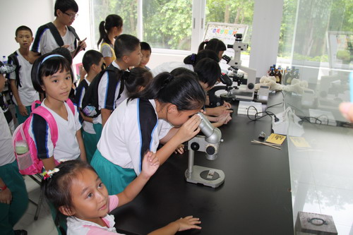 下午,小队员们观赏了植物科普电影,了解了植物的神秘生活和独特习性。在互动实验室里,小朋友亲手制作了植物押花卡片,他们小心翼翼的用干花组合自己的创意图片,并写上自己的衷心祝福,准备送给亲爱的爸爸妈妈或老师同学。随后的植物魔术,让小朋友惊叹不已,橘子皮可以喷出焰火、紫色包菜调出或红或绿的饮料、洋葱汁液写密信等等,让小朋友们在游戏中感受植物的千变万化。显微镜下奇妙的茎、叶、花、子房的细胞结构吸引了孩子们的好奇目光;解剖镜下蚂蚱和苍蝇的复眼结构更是让小朋友们啧啧称奇。小朋友们最后到生物园的科普教育径开展了“寻找我的小树”游戏,让他们在大自然中懂得如何观察、记忆植物的特征。