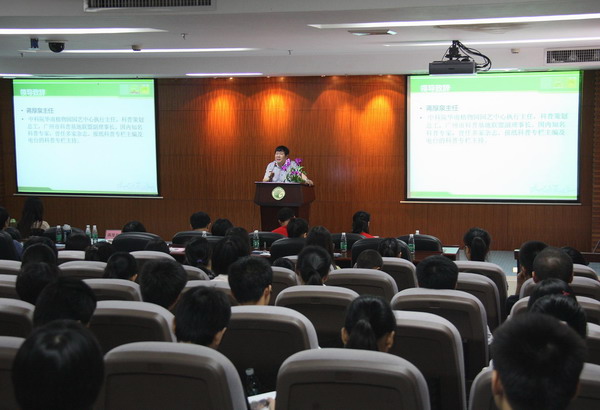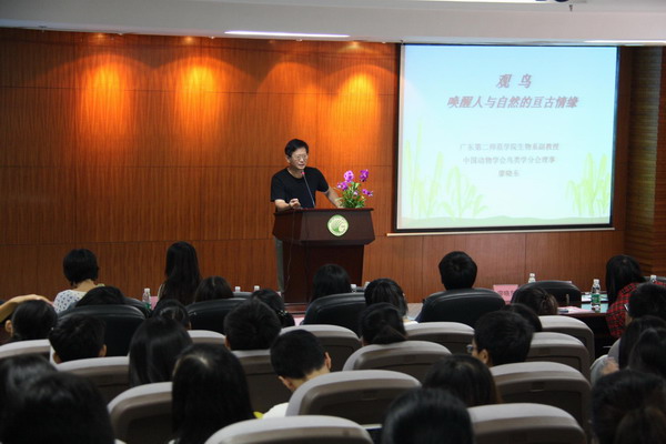 广东第二师范学院廖晓东副教授通过《观鸟唤醒人与自然的自古情缘》的精彩演讲,为同学们拨开观鸟世界的神秘面纱,阐述鸟类与人类的亲密关系及观鸟的历史与现状。随后,廖晓东副教授呼吁与会人员积极参与由华南植物园和施华洛世奇光学公司联合举办的观鸟、护鸟科普活动,希望大家珍惜自然、热爱自然,真正拥有自然、享受自然。老专家陈忠毅研究员则以《华南植物园发展历史》的精彩报告,向与会者展现华南植物园不同时期老一辈科学家通过艰苦创业建立起来的光辉业绩,以及朴实的“献身科学、奉献社会、造福人类、报效祖国”科学精神。他勉励大家积极投身于我国的科学事业,为建设我们共同的美好家园贡献自己的聪明才智。