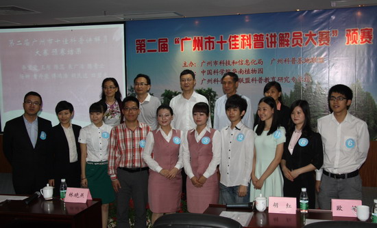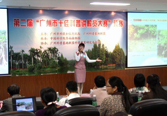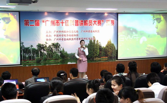 4月27日,第二届“广州十佳科普讲解员大赛”预赛在华南植物园举行。来自天河区、黄埔区等四个行政区的9家科普基地15名参赛选手进行了紧张的角逐,决出了10名优胜选手进入下一轮的决赛,华南植物园的两位参赛选手分别以本赛区第2名和第3名的优秀成绩脱颖而出,双双成功晋级决赛。