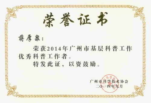 蒋厚泉获“2014年广州市基层科普工作优秀科普工作者”称号