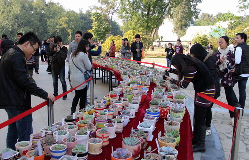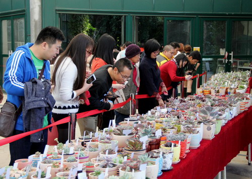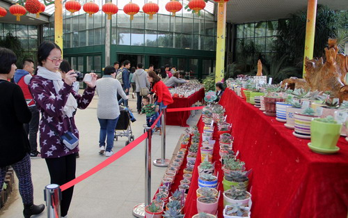 元旦期间,华南植物园推出了“第二届荟萃园艺景天植物展”、“巨型木根雕展”和“观鸟自然导赏”等系列科普活动。景天科植物专题展览展出近年来华南植物园从国内外精心收集和繁育的景天植物2000个品种和种类,汇集25属、11杂交属,其中石莲花类超过1400个、长寿花90个、水泡30个、莲花掌类60个、青锁龙类130个、仙女杯类25个、景天属类100个、长生草200个品种,其中有不少是近年新培育引进的新品种和奇特品种。绚烂的色彩、别致的布展、盛大的场面,让游客不时驻足观看、拍照留念、流连忘返。