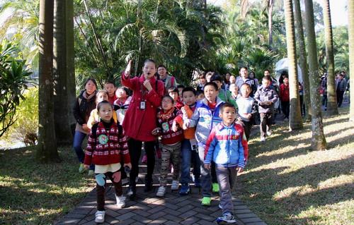 在科普讲解员的带领下首先来到了棕榈园,孩子们和家长当起了侦查兵,玩起了“植物大探秘”, 大部队一路走来一路听,他们突然被一棵形状奇特的植物吸引住了,有小朋友说这像一颗巨大的麦穗,有的说像一位老爷爷!近距离一看,其实这颗“大麦穗”是桄榔,它还有个名字叫“砂糖椰子”,割取花序汁液可熬制砂糖;而一些植物的模样也很有趣,它的树干像竹子一节一节,它的名字叫“三药槟榔”,很多人都把它误认为是竹子;而这一丛的叶子与鱼的骨架很相似,人们就叫它“鱼骨葵”;这些叶子看起来就像金鱼的尾巴,所以叫“鱼尾葵”;那边一棵棵的树干就象一支支天然的XO酒瓶,它就是来自马达加斯加的“酒瓶椰子”,每年冬天,工人们都要帮它穿上薄膜外套,以防冻伤……听到科普导游有声有色的讲解植物特性时,大家都不禁赞叹自然的神奇,孩子们时不时为自己的新发现而兴奋不已,家长和孩子们在学习知识的同时,尽情享受着大自然的“森林浴”。