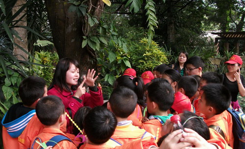 师生们在科普讲解员的带领下走进专类园进行植物探秘之旅。果核像人脸的人面子树、林中美少女柠檬桉、苦尽甘来的神秘果、与恐龙同时代的古老植物苏铁、做芭蕉扇的蒲葵、尾巴开叉的叉尾太阳鸟、全身黑色的乌鸫……同学们用眼睛观察千姿百态的植物世界,用耳朵聆听各种鸟类的叫声。专类园内丰富多样的植物和鸟类,使同学们大开眼界。面对自己家乡没有的植物,同学们特别好奇,他们仔细听,认真记,不时向科普讲解员提出一些问题。在趣味问答环节,科普讲解员结合植物的特征、叶形、花色、用途等提出问题,同学们根据所学所思回答,气氛热烈欢快。