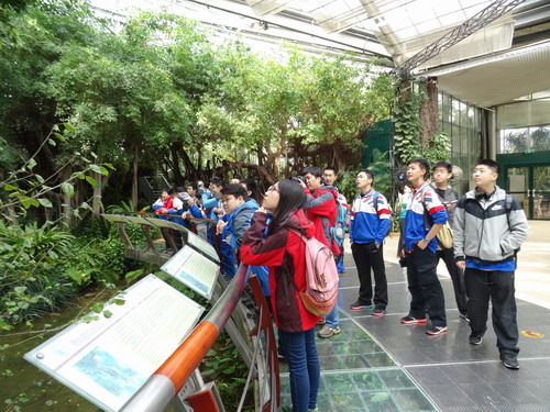 活动后,同学们在科普老师的带领下考察世界植物奇观——华南植物园温室群景区。在热带雨林室、沙漠植物室、高山/极地植物室、奇异植物室、植物水族馆,同学们认识了“世界上最毒的树——见血封喉”、“树上结西瓜的铁西瓜”、“奇妙的绞杀现象——肚子里别有洞天的空心树”、“奇妙的板根现象——犹如板墙的四数木”、“老茎生花老茎结果——树菠萝”、“神奇的热带食虫植物——猪笼草、瓶子草、捕蝇草”、“点着生日蛋糕的仙人球——蓝云”、“碧叶如盘可载人的王莲”正在施展“变温魔法”吸引昆虫在享受中为其完成传粉等奇趣植物。来自世界各地的新奇植物及生态景观让同学们大开眼界,充分展示了世界植物奇观和赋予美丽传说的植物世界,诠释了世界植物科学之旅的神秘与梦幻。植物标本制作、树木年轮测试等体验活动让同学们对生物课本知识有了感性的理解与认识。