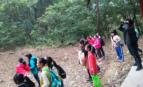 随后,工作人员带来观鸟望眼镜,并给每位同学分发了“鼎湖山常见鸟类图册”。同学们在工作人员的带领下进入了森林,开始寻觅野生鸟类。在途中,一个个惊喜接连出现,首先是一名学生地发现了在树丛中乱窜觅食的长尾缝叶莺;接着是见到了广东省省鸟——白鹇拖家带口的在大树底下悠闲的觅食;随后在溪水边,面睹了冬候鸟——黑尾蜡嘴雀十分警惕的站在溪边喝水。孩子的咳嗽声或其它发出响声的动作,常惊得鸟儿瞬间消失在密林之中。有时候,,虽不见鸟类的身影,同学们能听到来自四面八方鸟类的叫声,这声音如同钢琴曲般美妙动听。在活动期间,工作人员还给同学们介绍了一些植物学的基本知识,讲解了为什么鼎湖山的负氧离子如此丰富等生态学知识。