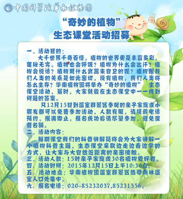 大千世界千奇百怪,植物的世界更是丰富多彩,奥秘无穷。植物也会呼吸?植物为什么会出汗?植物会说话?植物用什么武器来自卫的呢?植物跟我们人类的关系是如此密切,没有植物,我们人类将怎么生存?华南植物园将举办奇妙的植物生态课堂活动,届时,大家就能在生态课堂中一一找到问题的答案。