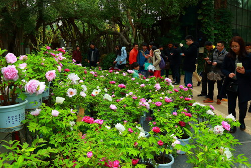 春节期间,华南植物园举办了第四届牡丹风情节,营造了良好的节日气氛。牡丹的自然花期为春天的4-5月,华南植物园此次从洛阳引进牡丹苗,在园内利用先进的栽培技术,对其进行花期调控,使其反季节提前开花,让南方市民不出远门,春节在家门口就能欣赏百花之王的魅力。此次牡丹风情节荟集了红、紫红、粉、蓝、白、绿、黄、黑、复色等九大色系、六大花型,共80个品种8000余株牡丹。除了较为常见的洛阳红、胡红等品种外,绿色的豆绿,黄色的姚黄、蓝色的菱花湛露、黑色的青龙卧墨池、冠世墨玉、红色的太阳、花王等都是难得一见的珍稀品种。而复色的二乔、岛锦及一株树上开数种花色的什锦牡丹更是稀有。法国的金阁、美国的海黄、日本的芳纪、花王等带来浓浓的异域风情。牡丹展规模宏大,花色齐全,珍奇品种多,让市民大开眼界,绚烂的色彩、别致的布展、盛大的场面,让游客不时驻足观看、拍照留念、流连忘返。