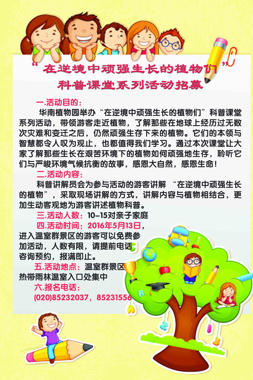华南植物园举办“在逆境中顽强生长的植物们”科普课堂系列活动,带领游客走近植物,了解那些在地球上经历过无数次灾难和变迁之后,仍然顽强生存下来的植物。它们的本领与智慧都令人叹为观止,也都值得我们学习。通过本次课堂让大家了解那些生长在艰苦环境下的植物如何顽强地生存,聆听它们与严峻环境气候抗衡的故事,感恩大自然,感恩生命!