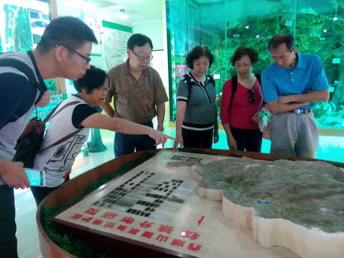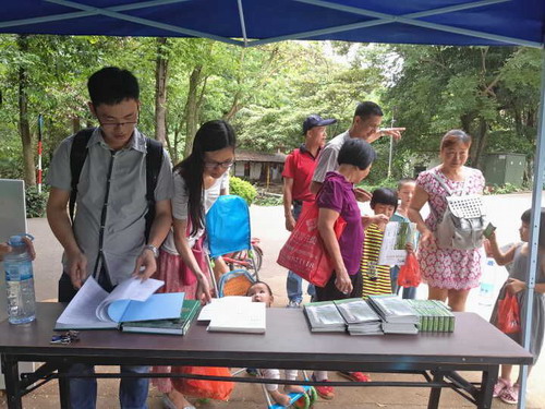 雨后天晴的鼎湖山,天蓝地绿,风清气爽。游客们在工作人员的引导下兴致勃勃的观看了鼎湖山珍稀濒危动植物展板、濒危龟类保护专题科普展板,观看了中国自然保护区主题展厅,并了解到鼎湖山保护区是中国的第一自然保护区的历史地位以及丰富的生物多样性,增长了他们对动植物的见识。工作人员在鼎湖山树木园内架立观鸟望远镜供来访的游客欣赏和观看鸟类,传授观鸟知识。工作人员还向游客们赠送了自然保护宣传册、野外观鸟指导手册和图文并茂的鼎湖山常见鸟类科普扑克牌,让他们在日常生活中认识生物多样性和保护环境的知识。
