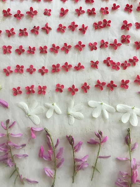 植物处理及压制实操,提供给每位学员新鲜花材,教授厚、薄花材、单瓣和重瓣花的花材处理和压制方法,包括微波干燥法、干燥板压制法等。