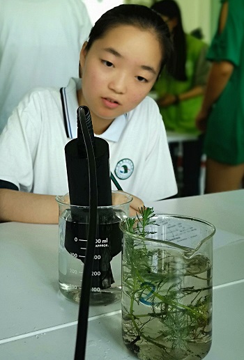 掌握了基本的实验方法之后,同学们便开始兴致勃勃地分组开展各项实验,使用各类感应器获取实验对象的相应数值。如不同种类水的PH值、人呼出二氧化碳的量、土壤的干湿状况及温度、电筒的光照量、水中溶解氧量等。