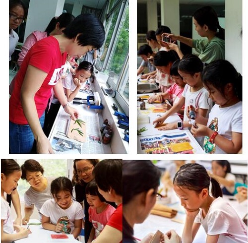 认识了罗汉松和它的裸子植物家族,手作课程正式开始。第一步压花,发挥出天马行空的想象,将罗汉松叶在牛皮上压出各种花样,只为给牛皮钱包增加一份纯天然美丽花纹。第二步,穿针缝线,将准备好的牛皮片亲手缝制在一起,一个小巧的包身就这样完成了,老师可是教了我们高端的双针缝法哦。第三步,上色,将压好花纹的皮片进行上色,红色、绿色、黄色各凭心意,深浅渐变全看手艺。第四步,将有压花的包盖与之前的包身缝合在一起,一个手作钱包就在欢声笑语中完成了。
