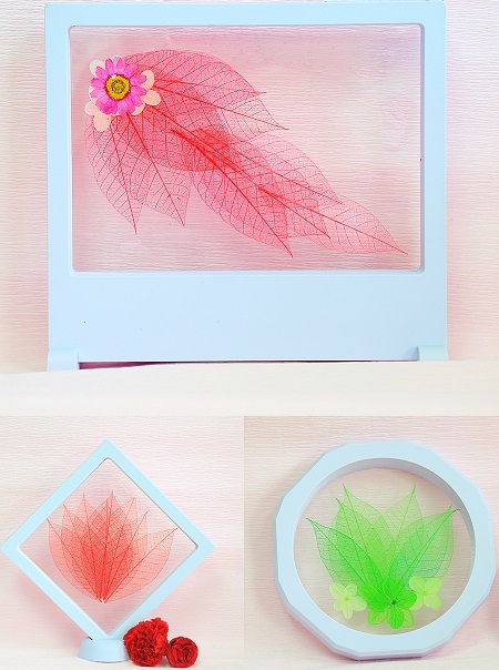 (2)通过化学处理后,自己动手去掉叶片上的表皮和叶肉组织,留下网状的脉纹,再通过纯植物提炼的色素进行染色。