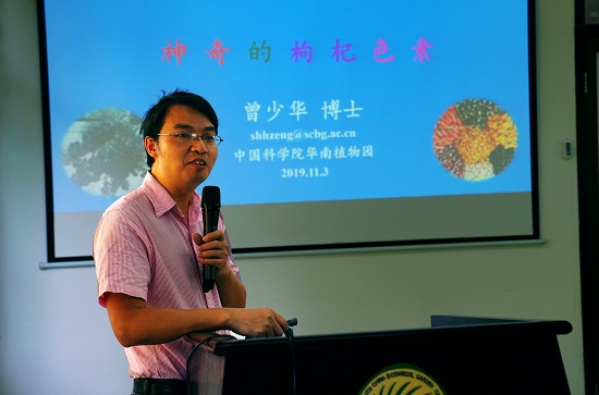 此次讲坛由园艺中心副主任夏汉平研究员主持。主讲人华南植物园曾少华博士带来以神奇的枸杞色素》为题的知识讲座,向社会公众展示枸杞功效最新的研究进展,以枸杞为例,讲述植物色素的种类、植物色素对植物生长、繁衍等方面的作用;以及植物色素对人体健康方面的功能。