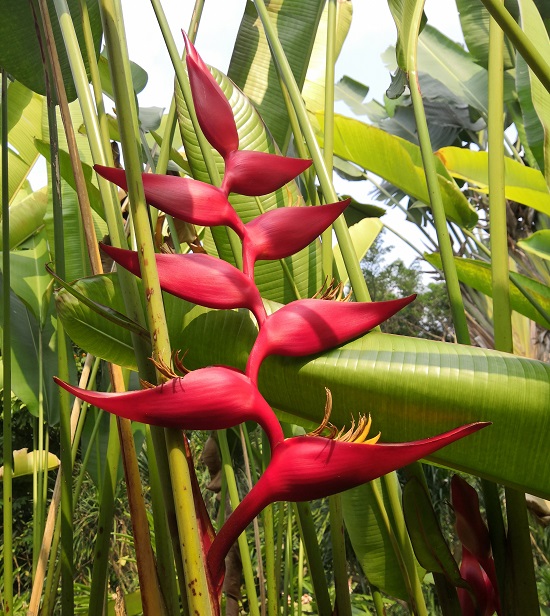 金嘴蝎尾蕉艳红色的花朵垂挂着,远远望去,犹如一串串红色的鞭炮。