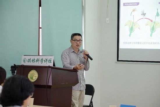 花儿千娇百媚、姿态万千,送花早已成为城市生活中的一种流行,每逢节日花价都要翻番,可见现代人对花的需求可真是很大。但我们是否想过自然界中的花儿到底是为谁而盛开?娇艳的花儿又在等待着谁?5月5日,“五一”假期的最后一天,第40期“琪林科学讲坛”迎来了中科院华南植物园的传粉生物学博士罗世孝研究员,他以“传粉的力量:揭秘夜空下的植物红娘”为题,从花的性别、植物开花的目的、什么是传粉、夜空下的传粉红娘及为什么要研究和保护传粉昆虫五个方面对开花植物与传粉昆虫的互利共生关系进行了深入浅出的讲解。讲座过程中金句频出,给现场和线上的近千名观众奉上了一道有趣又有料的“科普大餐”。本期讲座由园艺中心主任王瑛研究员主持。