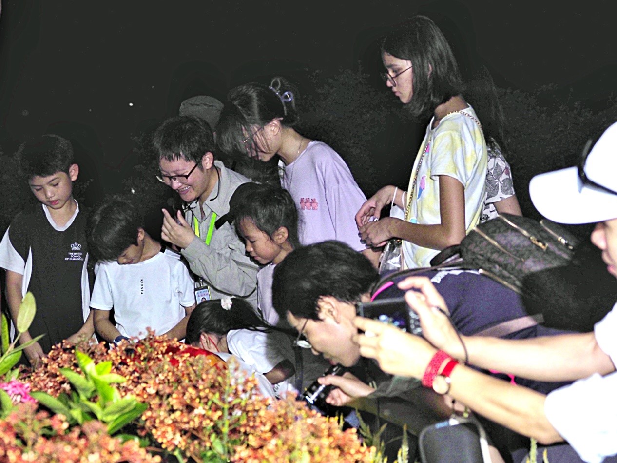 黑夜中怎么找到小生命呢?花前叶上树下——有植物的地方就有小动物,植物是它们生活、游戏、猎食的地方。看,透亮的叶片下有团小阴影?有经验的小朋友发现了叶下隐藏的小飞蛾。